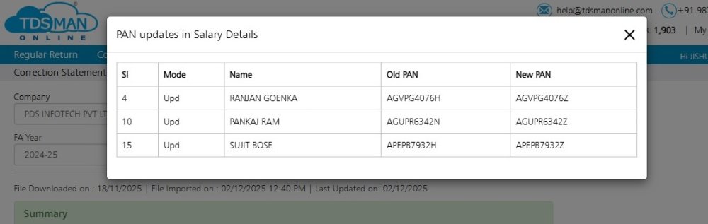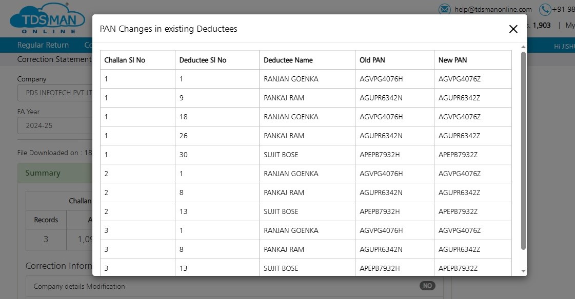 In this case there are 11 changes in the PAN of deductees so it is displaying ‘11’. Click on ‘View’ the details will get displayed as shown below: