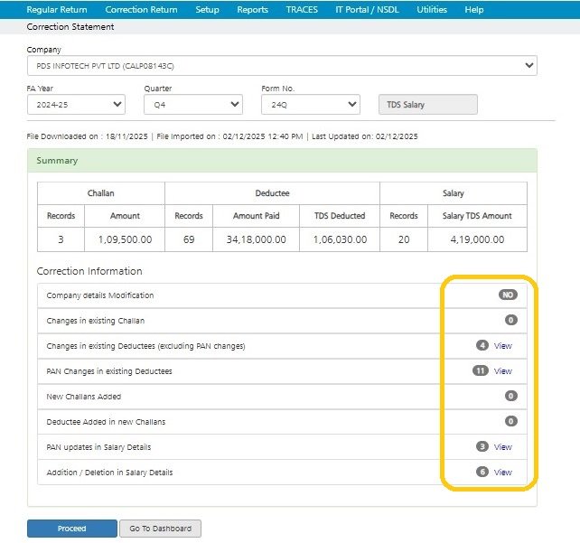 When The TDS file is imported to the online portal, click on Process to Correction Return. This will take you to the details of the Correction Return.
