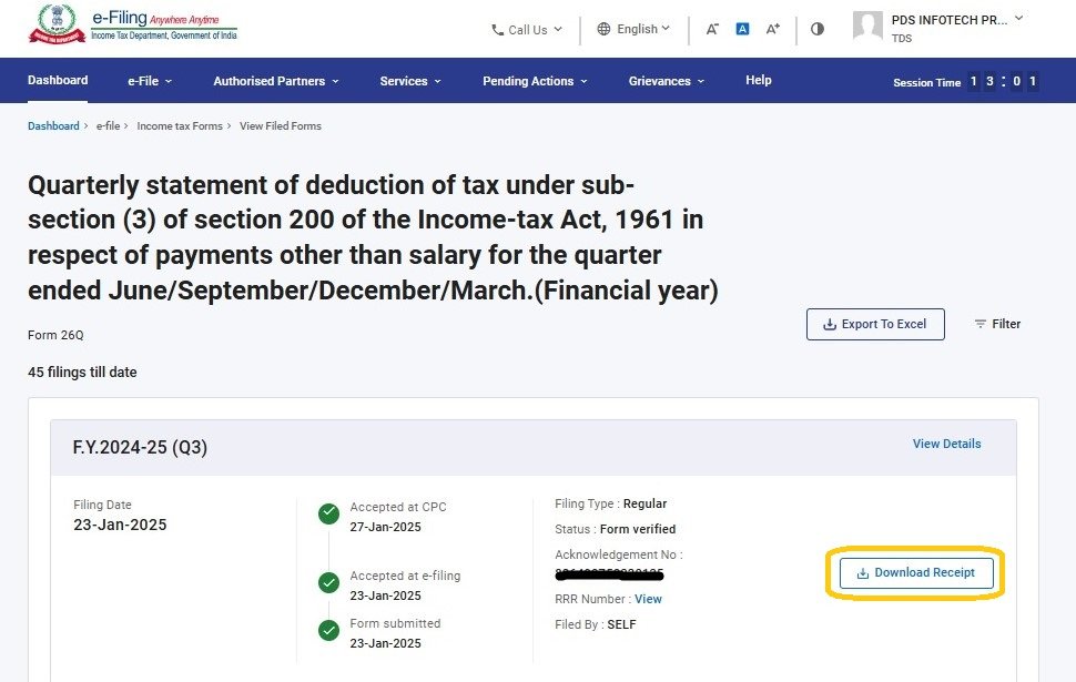 Once the TDS Return is successfully filed, a provisional receipt is provided. Information on the receipt is important for filing the next Return and should be downloaded and stored in the system.